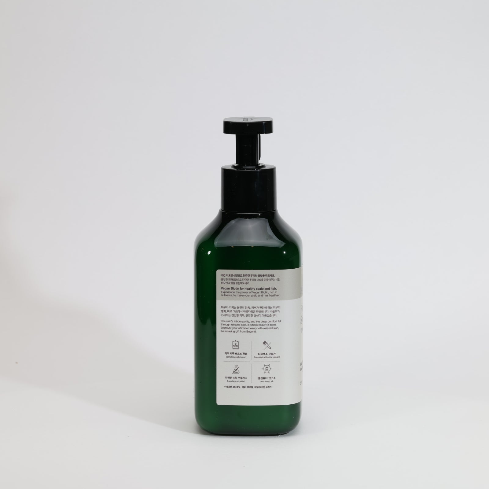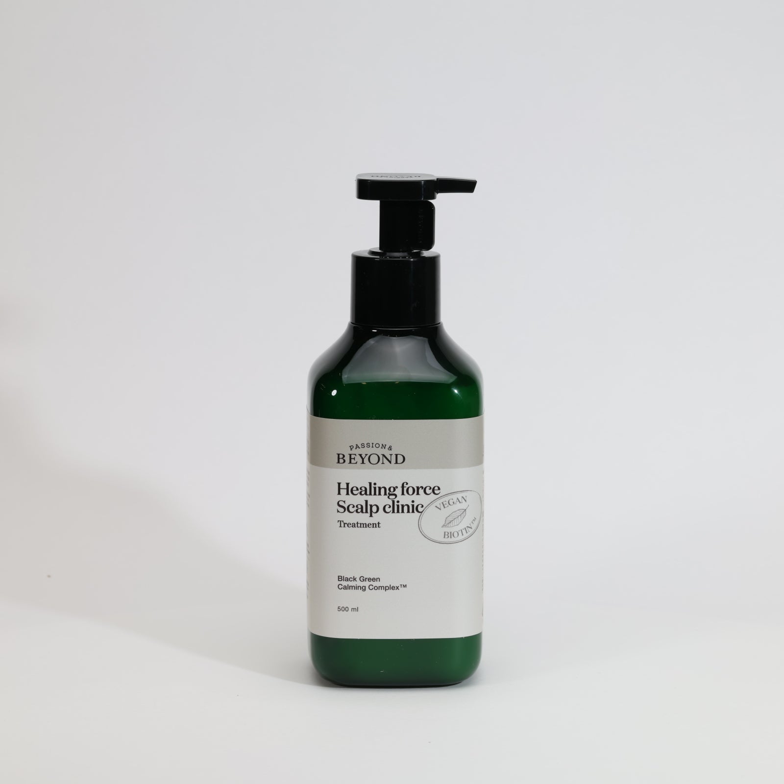 BEYOND Healing Force Scalp Clinic Treatment fortifies hair and scalp with innovative Vegan Biotin™ technology. The patented Black Green Calming Complex™, featuring black bean and mugwort extract, significantly improves hair condition while effectively eliminating dandruff and preventing hair loss. This professional-grade formula maintains low acidity and adheres to strict vegan standards, excluding animal ingredients, tar coloring, silicone oil, and sulfate-based surfactants. Distinguished by its Excellent rating from Dermatest 2022, this 500ml treatment delivers therapeutic benefits with a sophisticated artemisia and herbal fragrance profile.