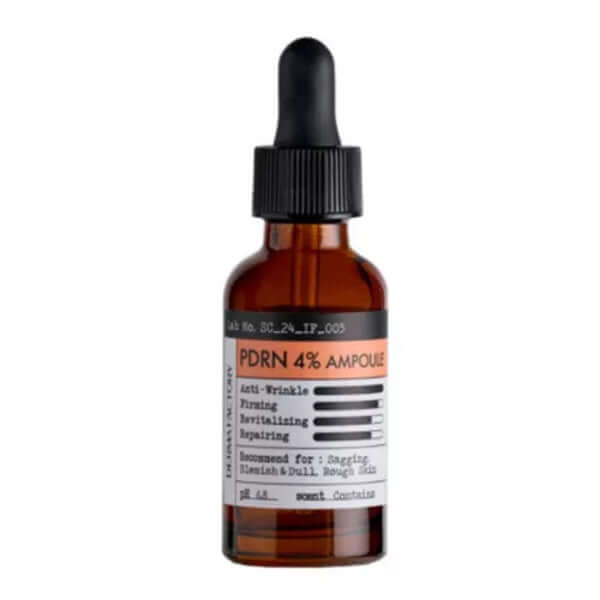 DERMA FACTORY PDRN 4% Ampoule delivers advanced firming care with 4% PDRN extracted from salmon DNA to restore lost elasticity. This premium formulation combines 1% Panthenol, 1000ppm hydrolyzed wheat protein, and 100ppm Proteoglycan—a glycoprotein from salmon cartilage that reinforces dermal structure. Together, these bioactive ingredients stimulate collagen synthesis, protect skin integrity, and effectively fill intercellular spaces for visibly firmer, healthier skin.