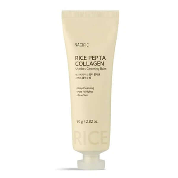 NACIFIC Rice Pepta Collagen Sherbet Cleansing Balm offers a deep yet gentle cleanse, effectively removing makeup while tightening pores for a radiant complexion. Enriched with Jojoba Seed, Rosehip Fruit, and Sunflower Seed Oils, it dissolves sebum and blackheads without irritation. Anti-sebum P and Gluconolactone provide pore care and mild exfoliation. Rice Bran Water, Rice Extract, and Lactobacillus Ferment boost hydration and revitalize skin. With nine peptides, it supports improved elasticity and vitality. This lightweight, non-greasy balm has completed skin irritation testing for safe, expert skincare.