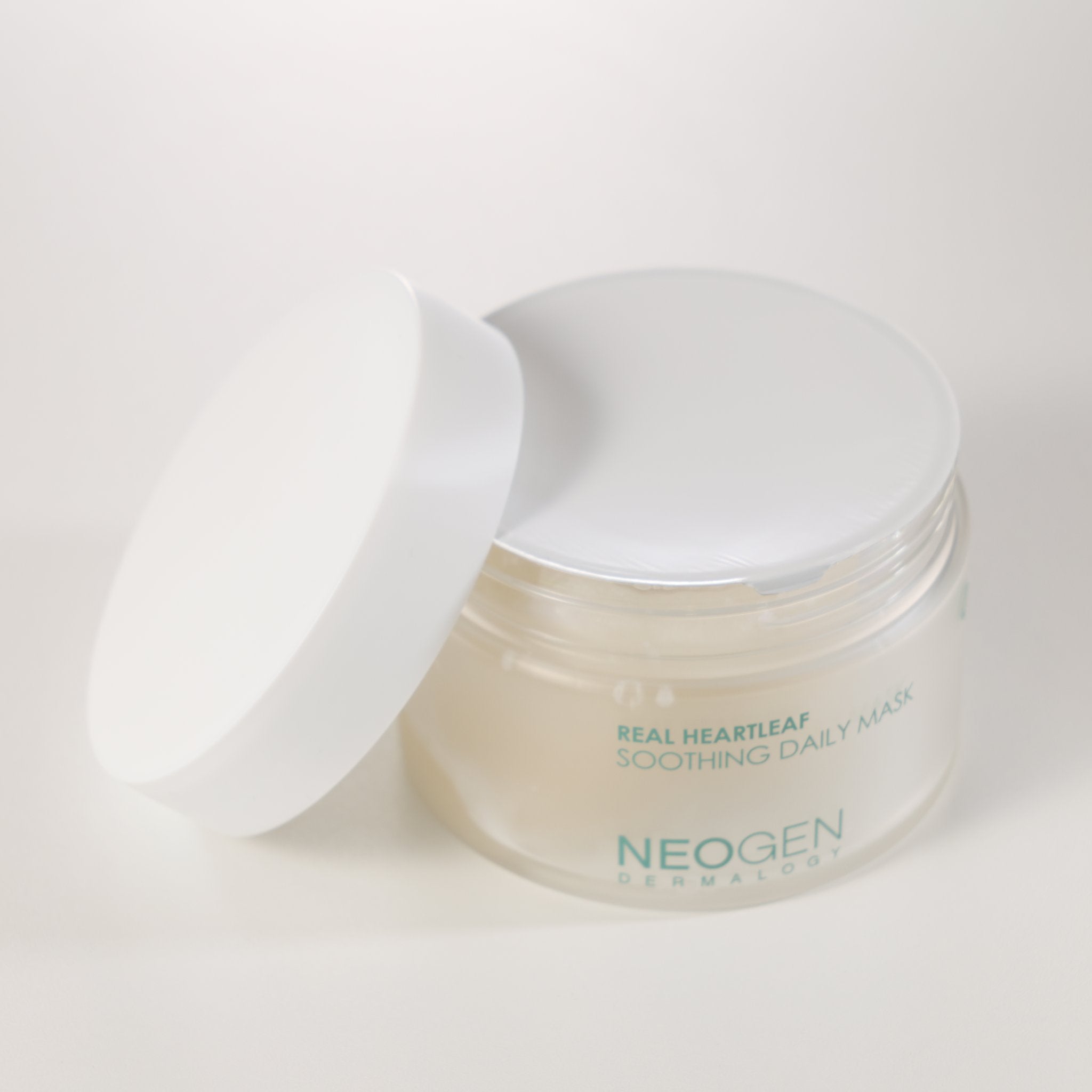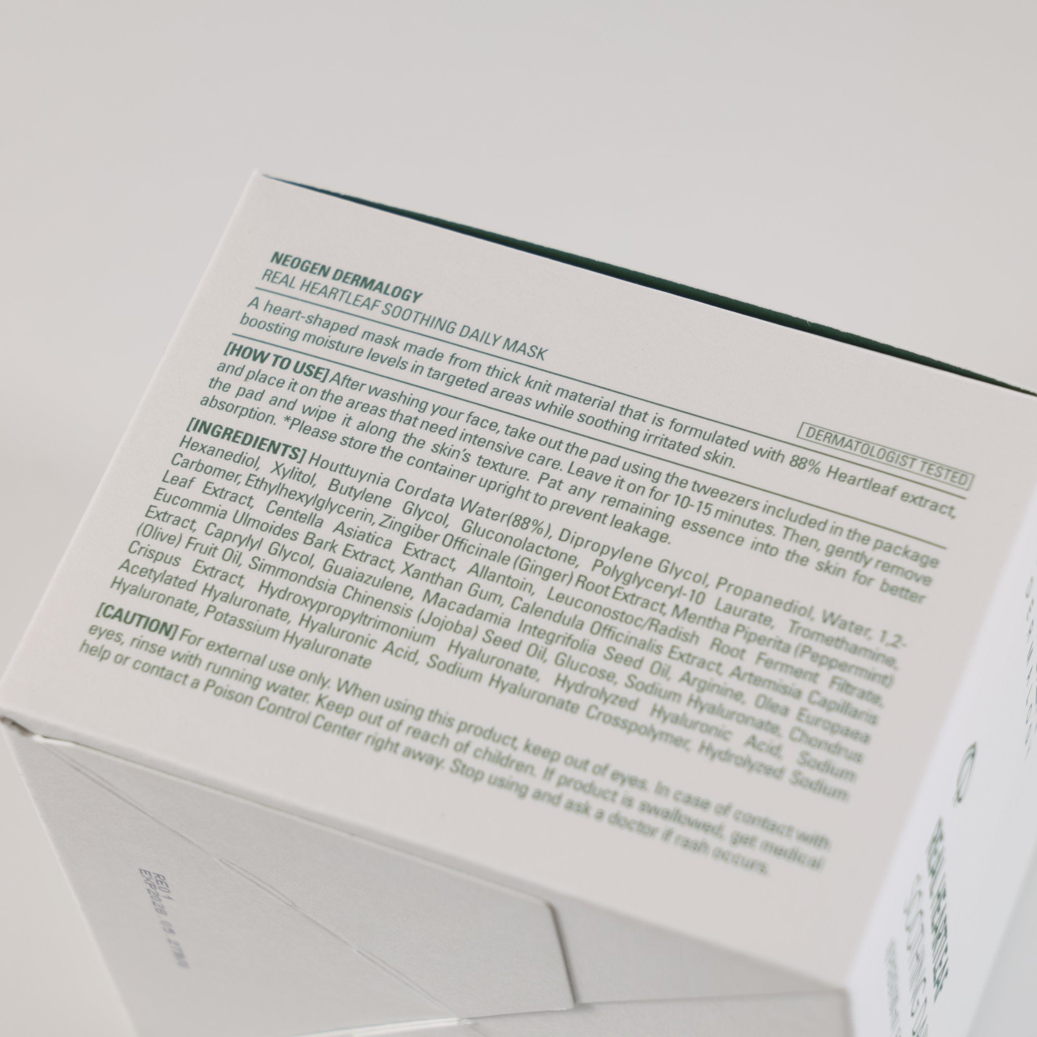 NEOGEN Real Heartleaf Soothing Daily Mask offers daily hydration and soothing care with 88% Houttuynia Cordata Water and eight types of Hyaluronic Acid. This 8.5cm heart-shaped sheet mask features a dual-texture design—one side knitted for gentle exfoliation, the other cotton for cooling hydration. Enriched with Guaiazulene and Centella Asiatica Extract, it supports the skin barrier, while Eucommia Ulmoides Bark and Artemisia Capillaris Extracts provide a refreshing cooling effect. Ideal for calming irritated skin and maintaining moisture balance every day.
